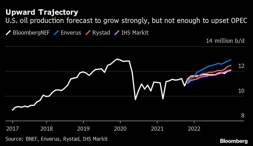 That newfound austerity means public oil companies in the U.S. now look like less of a risky investment, allowing them to attract the lowest bond yields they’ve ever seen. But because they’re using their cheap credit to retire debt instead of fuel new exploration, it will take until 2023 before the country’s total production will reach pre-Covid levels at current prices, three of the four major forecasters surveyed by Bloomberg said. Only Enverus forecasts the U.S. to be at its pre-pandemic high by December next year.