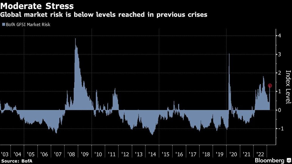Para obtener una imagen más amplia, un indicador de riesgo del mercado global de activos cruzados mantenido por Bank of America Corp. saltó al nivel más alto desde octubre esta semana, mientras que se mantiene por debajo de los niveles alcanzados durante la pandemia y 2008. El indicador mide los niveles de tensión en los mercados financieros, midiendo las oscilaciones futuras de los precios implícitas en los mercados de opciones de renta variable, tipos de interés, divisas y materias primas a escala mundial.