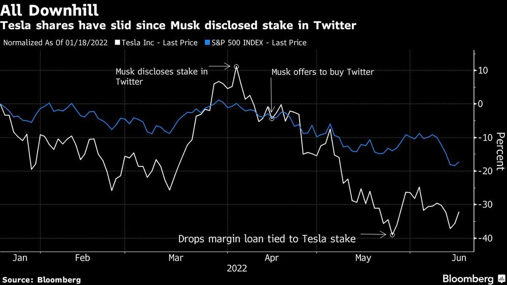 Tesla shares are down 36% since Musk first disclosed a stake in Twitter, while the the S&P 500 Index has fallen 17% over the same period.