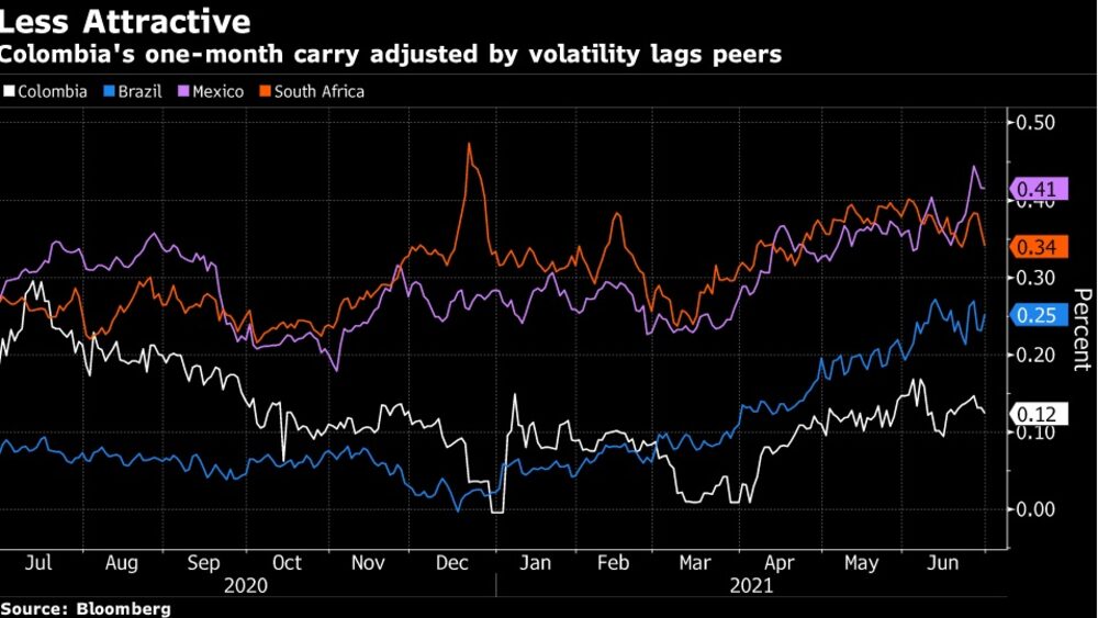 Incluso si los inversionistas coinciden en que el banco central tiene tiempo para endurecer la política monetaria, la moneda del país aún podría tener un desempeño inferior al de países como Brasil, México y Sudáfrica, donde se están produciendo recuperaciones similares y las tasas de interés son más altas. El rendimiento anual que obtiene un inversionista por mantener una posición larga en pesos colombianos durante un mes ajustada por la volatilidad del tipo de cambio es de solo 0,12%, la mitad de lo ganan los operadores en el real brasileño y menos de un tercio de lo que ofrece el peso mexicano, lo que impacta drásticamente el atractivo de la moneda andina.