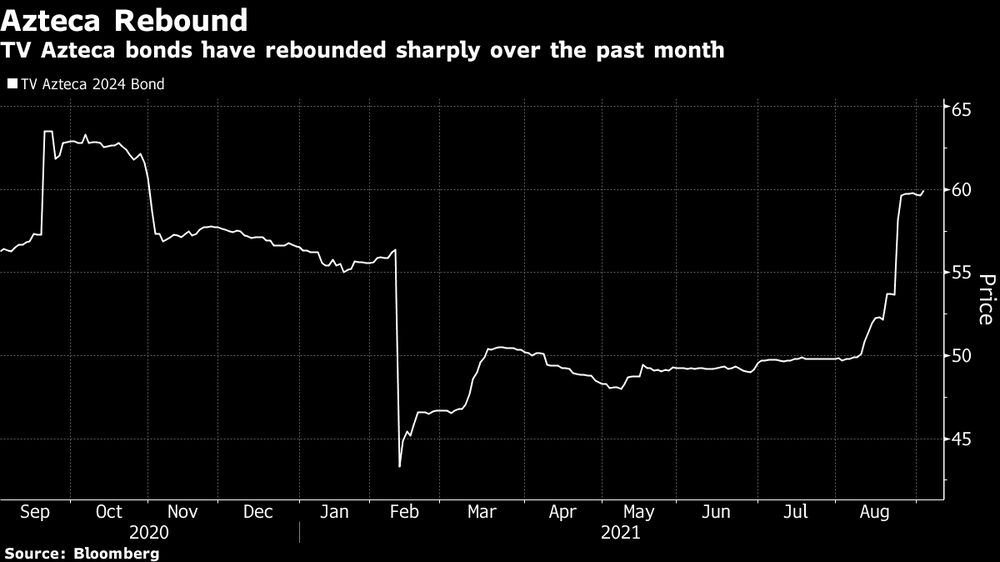 Si bien las negociaciones sobre la reestructuración de las deudas de TV Azteca SAB están en curso, el valor de sus bonos 2024 se ha recuperado a casi 60 centavos por dólar. Eso es casi un 50% más alto que el mínimo durante la pandemia y superior a lo que habían estimado al menos dos analistas. Sebastian Hofmeister, de Lucror Analytics, dijo que sería poco probable que cualquier acuerdo generara más de 50 centavos por dólar, mientras que Omar Zeolla, estratega de Oppenheimer, calculó la cifra en no más de 55 centavos.