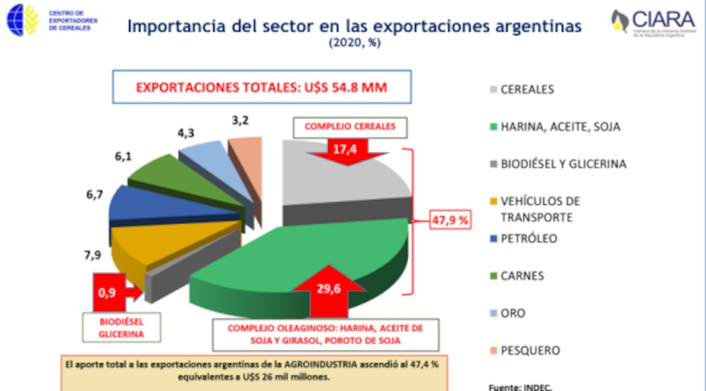 - La dimensión: En 2020, la agroindustria representó 47,9% de las exportaciones totales de Argentina. Solo el complejo sojero representó el 27% de las exportaciones totales del país el año pasado.