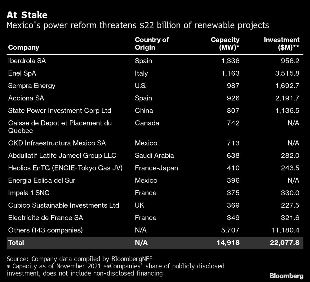 Bloomberg — La reforma eléctrica propuesta por el presidente mexicano, Andrés Manuel López Obrador, podría presentar dificultades para los más de US$22.000 millones en instalaciones solares, eólicas y otras de energía renovable, propiedad de importantes empresas extranjeras como Iberdrola SA y Sempra Energy.