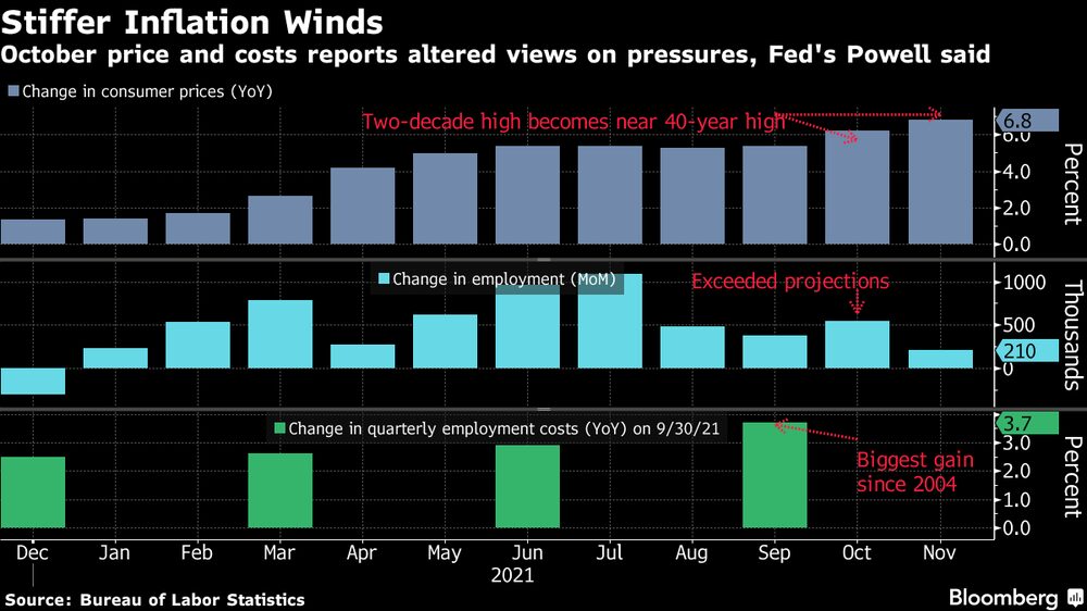 En un giro abrupto de política, la Fed aceleró la reducción de su programa de compra de activos y trazó una hoja de ruta para una serie de aumentos de las tasas de interés en los próximos años, iniciando con tres aumentos en 2022. Powell planteó también la posibilidad de que en poco tiempo el banco central comience a retirar liquidez del sistema financiero, lo que reduciría su enorme balance.
