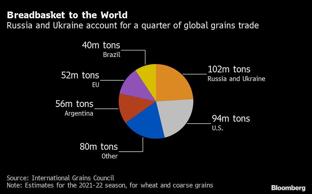 Los precios del trigo han saltado en las últimas dos semanas a un nivel récord, al tiempo que la invasión rusa de Ucrania cortó los envíos desde la región crucial del Mar Negro que se conoce como el granero del mundo. Eso ha dejado al mundo enfrentando un gran impacto en la oferta en un momento en que los precios de los alimentos están en su punto más alto. Rusia también es un gran proveedor de aceite de girasol y cebada.