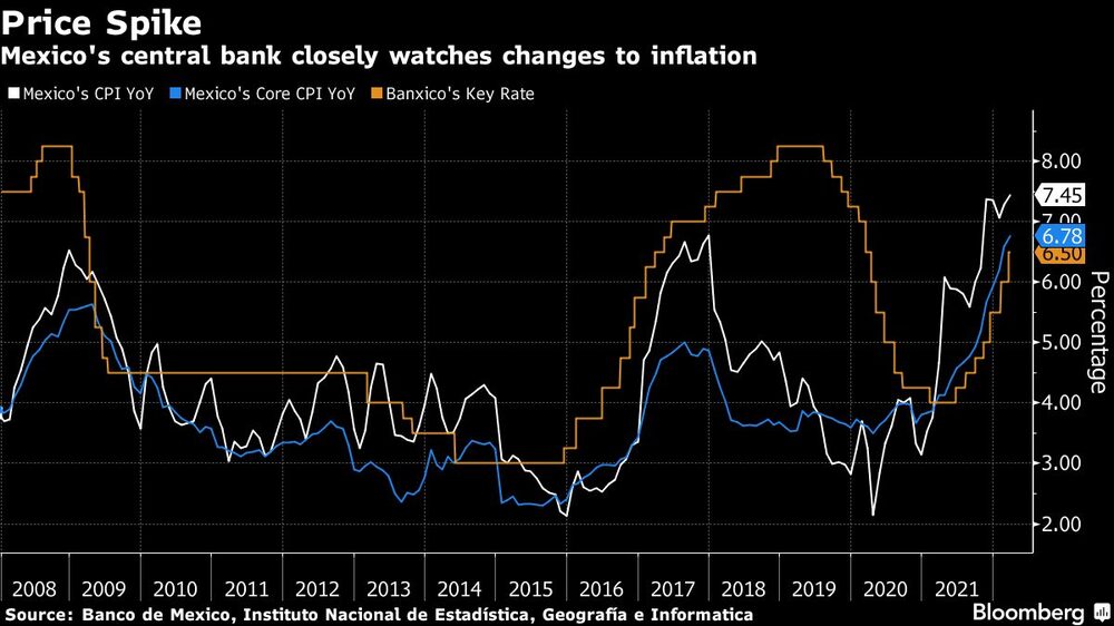 El banco central de México ha elevado la tasa de interés en 50 puntos básicos en cada una de sus últimas tres reuniones, y se espera que continúe aumentando los costos de endeudamiento para controlar las expectativas de inflación.