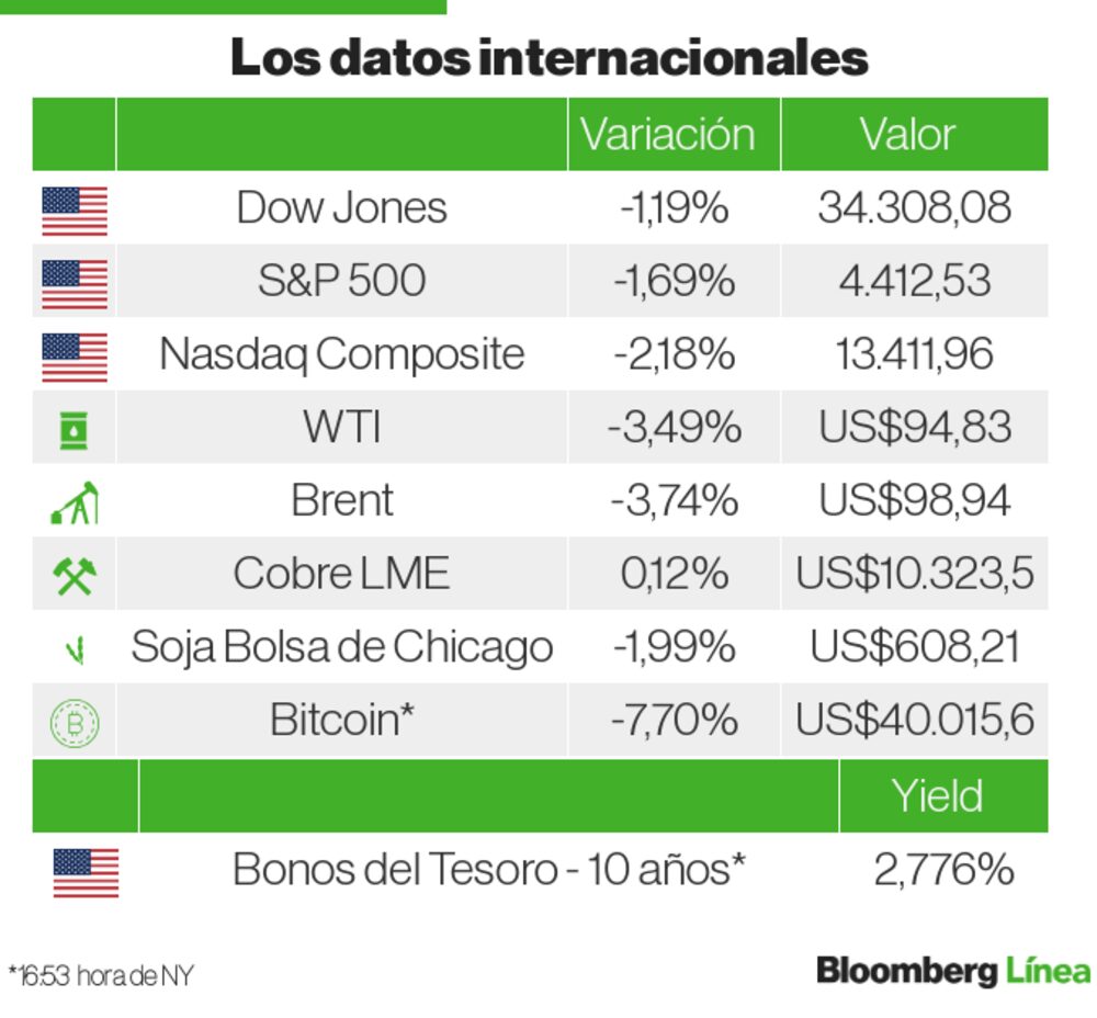 “Las acciones de EE.UU. cayeron a medida que continuaba la liquidación del mercado de bonos, ya que los inversores estaban preocupados por el endurecimiento monetario agresivo de la Reserva Federal, mientras que China continúa luchando con su último brote de Covid”, explicó Edward Moya, analista de Oanda.