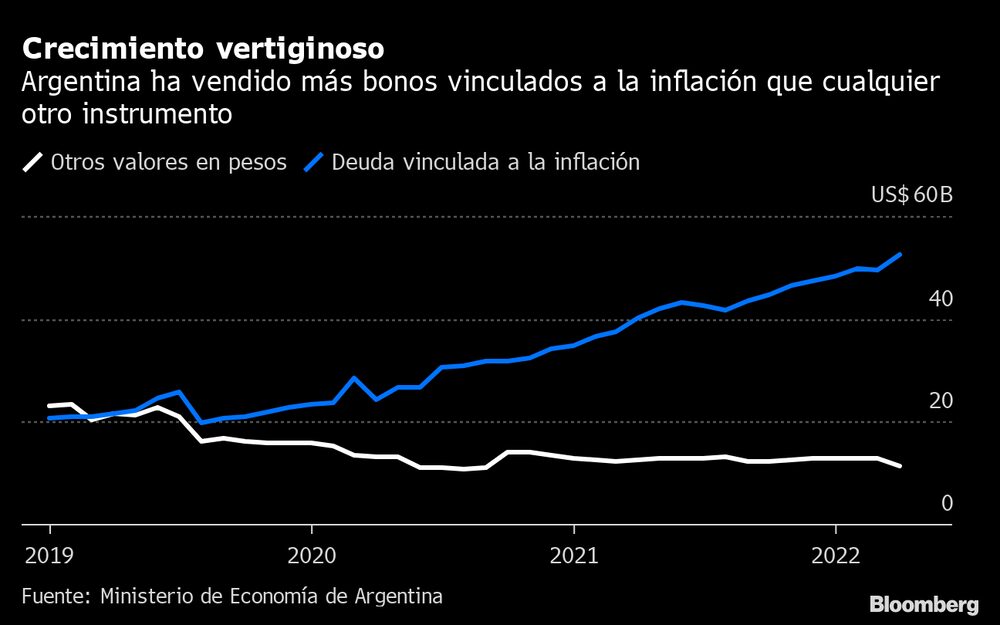 Los bonos Boncer que vencen en marzo de 2023 retrocedieron 8,1 centavos por peso, mientras que los valores vinculados a la inflación con vencimiento el 20 de septiembre subieron 0,3 centavos por peso tras la caída histórica registrada el día anterior. Los movimientos se deben a la preocupación de los inversores de que el Gobierno tenga que reestructurar sus obligaciones a medida que la deuda vinculada a la inflación, que se estima representa casi el 80% de la deuda en pesos, se convierte en una carga cada vez mayor. Los economistas estiman que la inflación cerrará el año en un 70%.