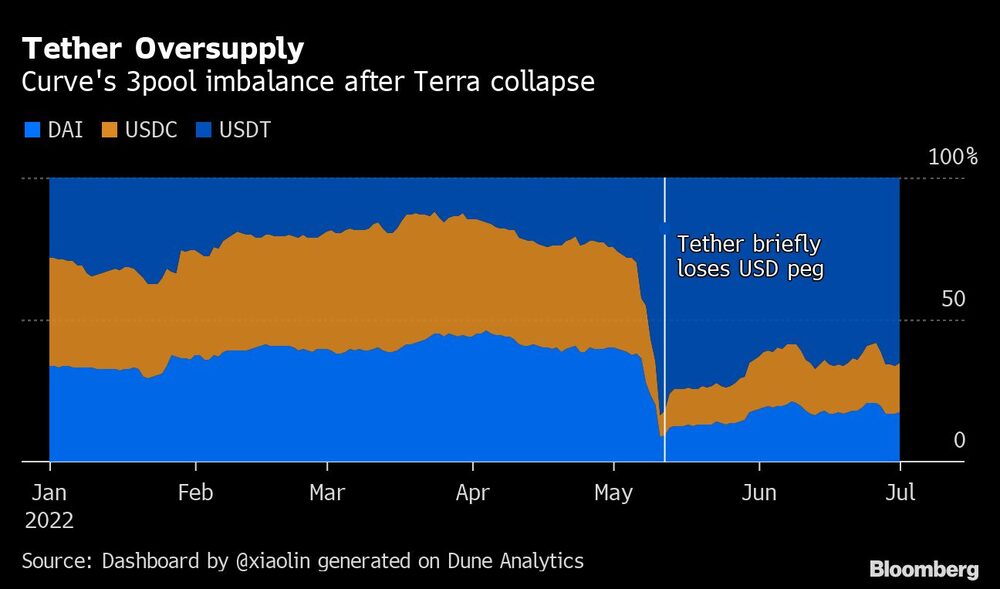 Esa porción subió hasta un 82% el 12 de mayo cuando la crisis de TerraUSD empeoró, sacando brevemente a Tether de su propia paridad.