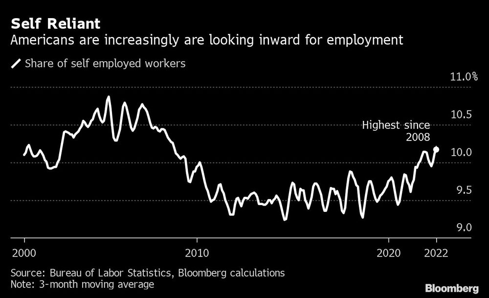 Bloomberg — La proporción de miembros de la población laboral de Estados Unidos que trabaja por cuenta propia ha subido al nivel más alto desde la Gran Recesión, a medida que el cambio en el mercado laboral causado por la pandemia estimuló a muchos estadounidenses a tratar de trabajar por sí mismos.
