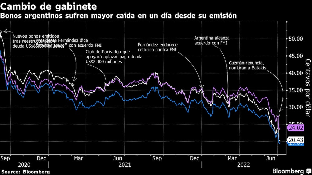 Los bonos de referencia con vencimiento en 2030 se han desplomado casi cuatro centavos por dólar, hasta los 20 centavos, desde que Silvina Batakis fue nombrada ministra de Economía el 3 de julio, amenazando con un giro a la izquierda en un Gobierno que lucha contra la turbulencia económica. Antes de la reestructuración de deuda hace dos años, los bonos, que tenían cupones más altos que los actuales, nunca cayeron por debajo de los 23 centavos.