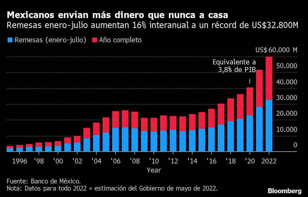 Las remesas alcanzaron US$32.800 millones en los primeros siete meses de 2022, también un récord.