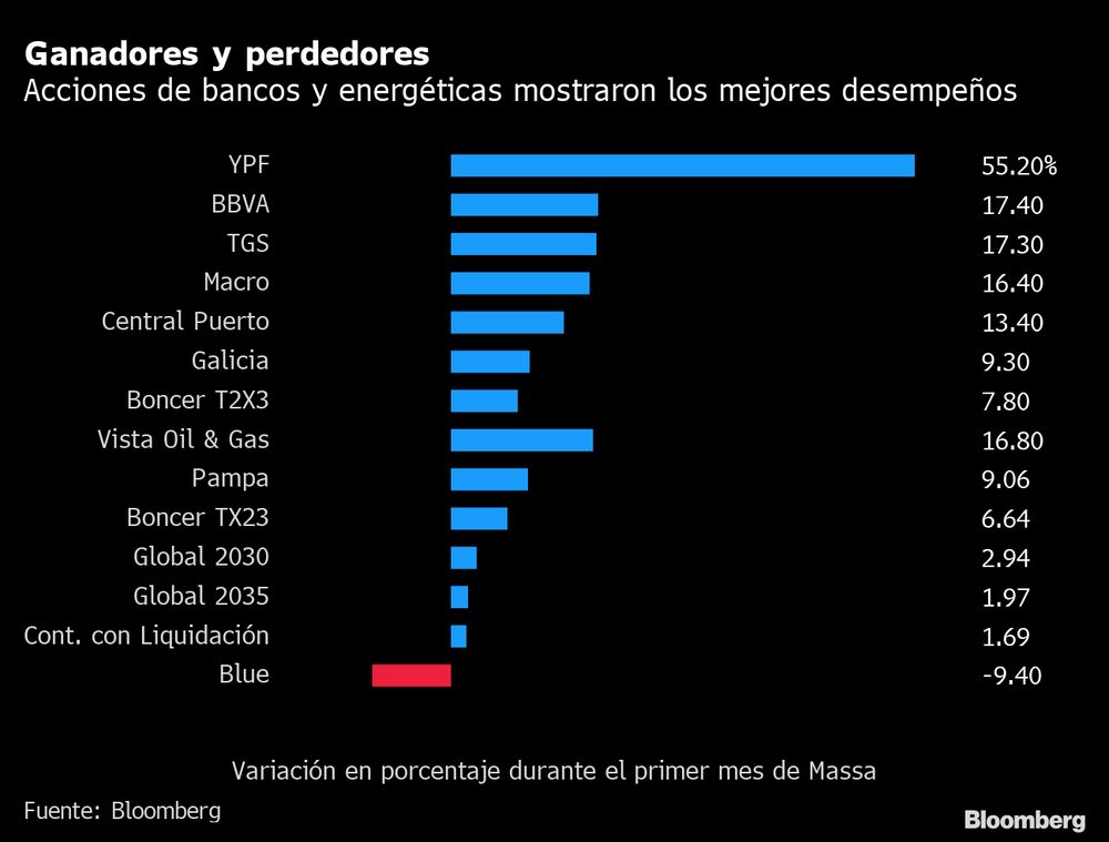 Entre las alzas, se destaca el desempeño de la insignia petrolera de Argentina, YPF, que sorprendió con un avance de 55,2% en los primeros 30 días de gestión de Massa. Se sabe, el aumento de tarifas anunciado por el nuevo ministro dio algo más de vuelo a las energéticas. Pero los equipos de research de agentes locales se esmeran en destacar los proyectos en Vaca Muerta, con el foco puesto en petróleo y gas.