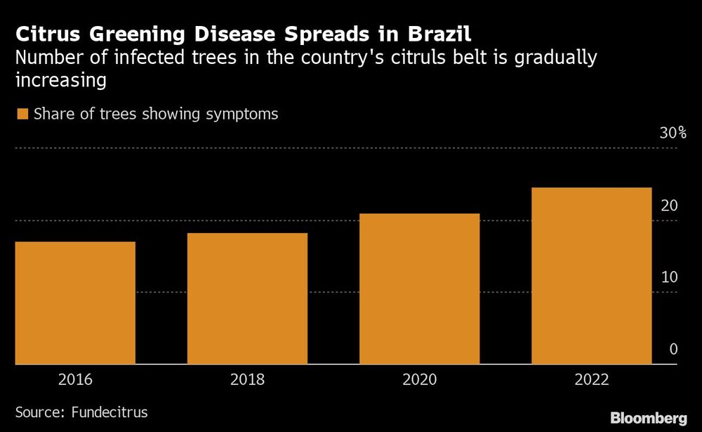 Citrus greening, a fatal illness that causes fruits to get smaller, fall off trees and produce bitter juice, is spreading across the nation that produces over 70% of the world’s orange juice. Nearly one in four orange trees in Brazil’s key orange-producing areas have the disease, according to research group Fundecitrus.