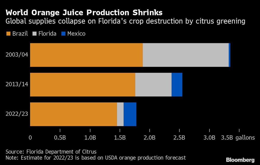 Florida’s decay has increased the world’s dependence on Brazilian crops. Output in the US’s top-producing state is set to be the smallest in almost eight decades due to a decades-long onslaught of citrus greening. Crop destruction following Hurricane Ian is seen reducing production even more. That leaves Brazil in a key position, with US demand for Brazilian juice already on the rise.
