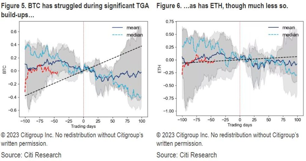 Citi analizó el rendimiento de los activos de riesgo durante las retiradas de reservas y descubrió que eran vulnerables a una mayor volatilidad y a rendimientos más débiles. Por ello, las perspectivas a corto plazo no parecen demasiado halagüeñas para bitcoin y ether. “Ambas monedas promedian rendimientos negativos en estos escenarios, y BTC ha tenido un rendimiento significativamente inferior en el caso medio”, escribieron el jueves los estrategas.