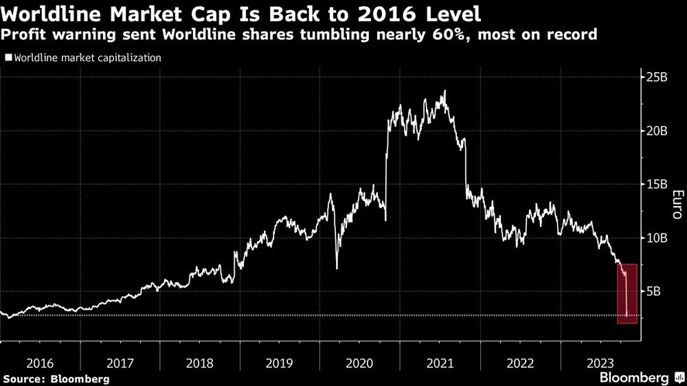 Las acciones de Worldline se desplomaron un 59% el miércoles, perdiendo 3.800 millones de euros (US$4.000 millones) de su valor de mercado, tras recortar sus previsiones de ventas y señalar los retos que plantea un gasto doméstico cada vez más cauto. Su advertencia siguió a rumores anteriores en el sector tras los decepcionantes resultados de su homóloga Adyen NA en agosto, y un recorte de las previsiones de ingresos de Cab Payments Plc, con sede en el Reino Unido.