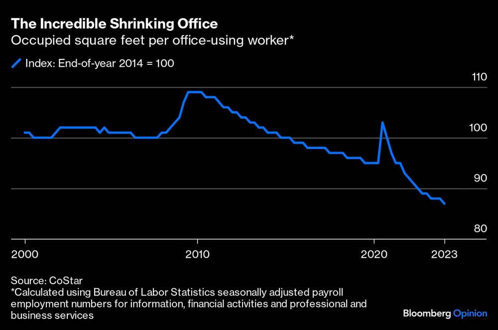 Blomberg Opinión — Durante la década anterior a la pandemia, la cantidad de espacio de oficinas por trabajador en Estados Unidos se redujo constantemente, una tendencia a la que se dio el encantador nombre de “densificación”. El ahorro de dinero fue uno de los motores, al igual que la creencia de algunos empresarios de que una distribución más densa fomentaba la interacción y la innovación. Pero el mejor predictor de la densificación fue “el crecimiento del empleo a nivel de mercado y la disponibilidad de espacio (o la falta del mismo)”, concluyó la correduría inmobiliaria comercial Cushman & Wakefield en un análisis del fenómeno realizado en 2018. Es decir, en los grandes mercados de oficinas, como Manhattan y San Francisco, y en los emergentes, como Miami y Nashville, las empresas simplemente contrataban trabajadores más deprisa de lo que podían encontrar espacio para ellos.