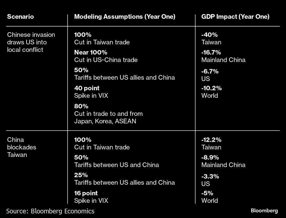 Modelando el costo de una crisis, Bloomberg Economics ha elaborado dos escenarios: una invasión china que involucre a Estados Unidos en un conflicto local y un bloqueo que corte a Taiwán del comercio con el resto del mundo. Se utilizaron una serie de modelos para estimar el impacto en el PIB, teniendo en cuenta la afectación a la oferta de semiconductores, la interrupción del envío en la región, las sanciones y aranceles comerciales, y el impacto en los mercados financieros.