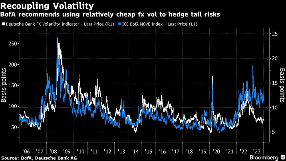 Están aconsejando a los clientes comprar opciones sobre divisas, que se volverán más valiosas a medida que las oscilaciones del mercado sean mayores. Estrategas como Bruno Braizinha también ponen de relieve una inusual brecha entre el índice ICE BofA MOVE, un indicador de la volatilidad del mercado de bonos del Tesoro, y el CVIX, que monitorea las expectativas de oscilaciones monetarias, y argumentan que los dos índices sin duda convergerán.