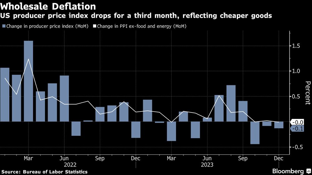 Bloomberg — Los precios pagados a los productores estadounidenses extendieron su retroceso en diciembre, lo que llevó a los operadores a aumentar las apuestas sobre cuán agresivamente la Reserva Federal recortará las tasas de interés este año.