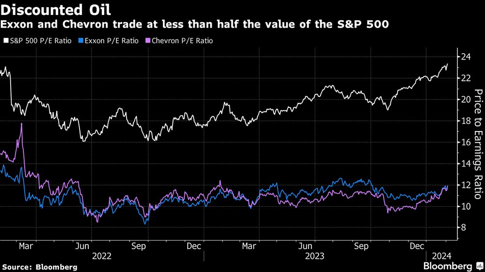 Bloomberg — Exxon Mobil Corp. (XOM) y Chevron Corp. (CVX) están generando rendimientos que no se veían desde su apogeo hace más de una década, con US$58,7 mil millones entregados a los accionistas el año pasado y más por venir en 2024, incluso si los precios del crudo caen. Sin embargo, están luchando por competir en un mercado de valores dominado por Silicon Valley.