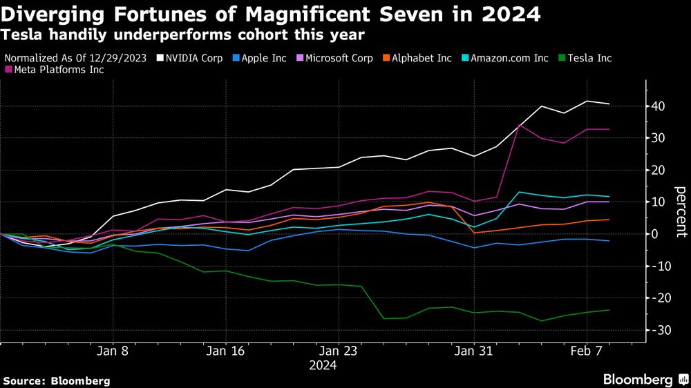 Nvidia es el componente de mejor rendimiento del índice Nasdaq 100 este año, al igual que en 2023, cuando las acciones se triplicaron. La acción es, con mucho, la que mejor rendimiento ha tenido entre los miembros de los llamados Siete Magníficos, en gran parte porque ha mostrado el salto más significativo en ventas y ganancias como resultado de la demanda relacionada con la inteligencia artificial.