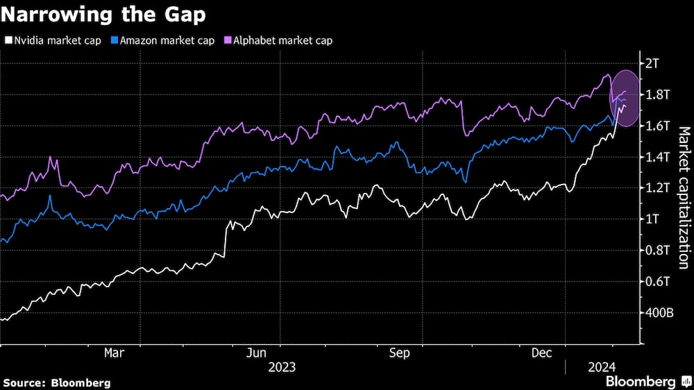 Habiendo sumado casi toda la capitalización de mercado de Tesla Inc. (TSLA) solo en los últimos dos meses, Nvidia vale US$1,72 billones, apenas por debajo de Amazon con US$1,76 billones, al cierre del jueves. Alphabet (GOOGL), propietaria de Google, la tercera empresa estadounidense más valiosa después de Microsoft Corp. (MSFT) y Apple Inc. (AAPL), no está muy lejos con US$1,82 billones.