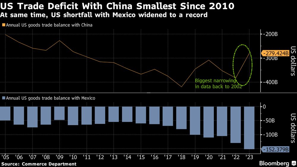 El déficit comercial de Estados Unidos se redujo el año pasado en la mayor medida desde 2009, ya que el valor de las mercancías importadas disminuyó y el superávit de servicios aumentó. El déficit de productos de la nación con China el año pasado se redujo un 27% a $279.4 mil millones, el más bajo desde 2010.