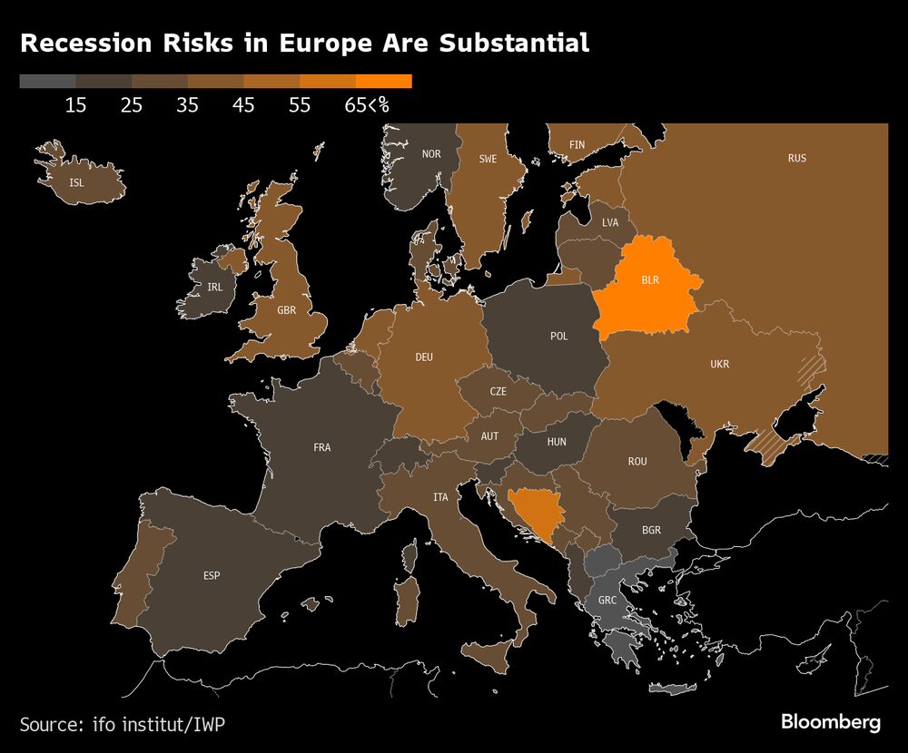 Las economías europeas recibieron un mal informe en una encuesta de expertos que mostró mayores riesgos de recesión debido a conflictos geopolíticos y mayores costos de energía. En la eurozona, las posibilidades de dos trimestres consecutivos de disminución de la producción hacia fines de año son más altas en Alemania y los Países Bajos.