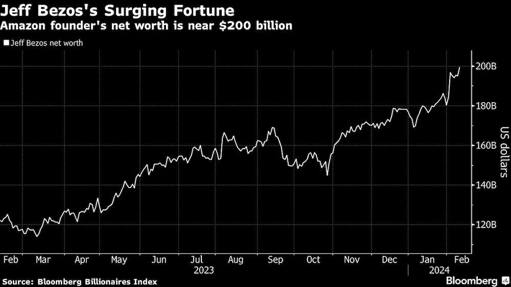 Amazon (AMZN) reveló el 2 de febrero que Bezos planea vender hasta 50 millones de acciones de Amazon en los próximos 12 meses, aprovechando así el aumento de las acciones que lo sitúa cerca de convertirse en la persona más rica del mundo. Su fortuna ha aumentado $22.6 mil millones este año a $199.5 mil millones hasta el viernes, según el Índice de Multimillonarios de Bloomberg.