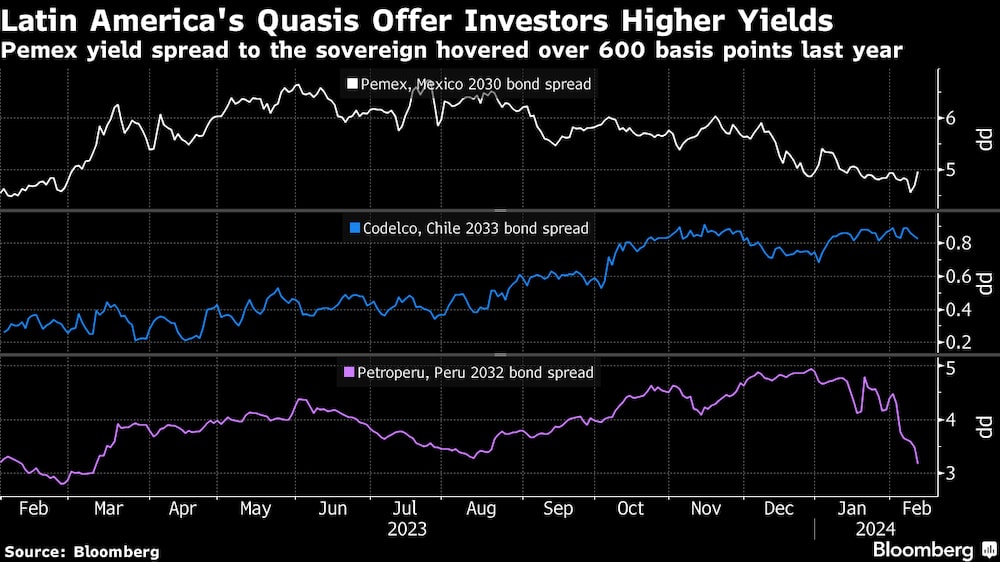 Empresas como Petróleos Mexicanos SA, Petróleos del Perú SA y Codelco de Chile atraen a inversores al ofrecer rendimientos mucho más altos que la deuda de sus respectivos gobiernos para lo que está resultando esencialmente el mismo riesgo. El argumento es que si la nación está prosperando, no permitirá que la compañía se declare en quiebra.