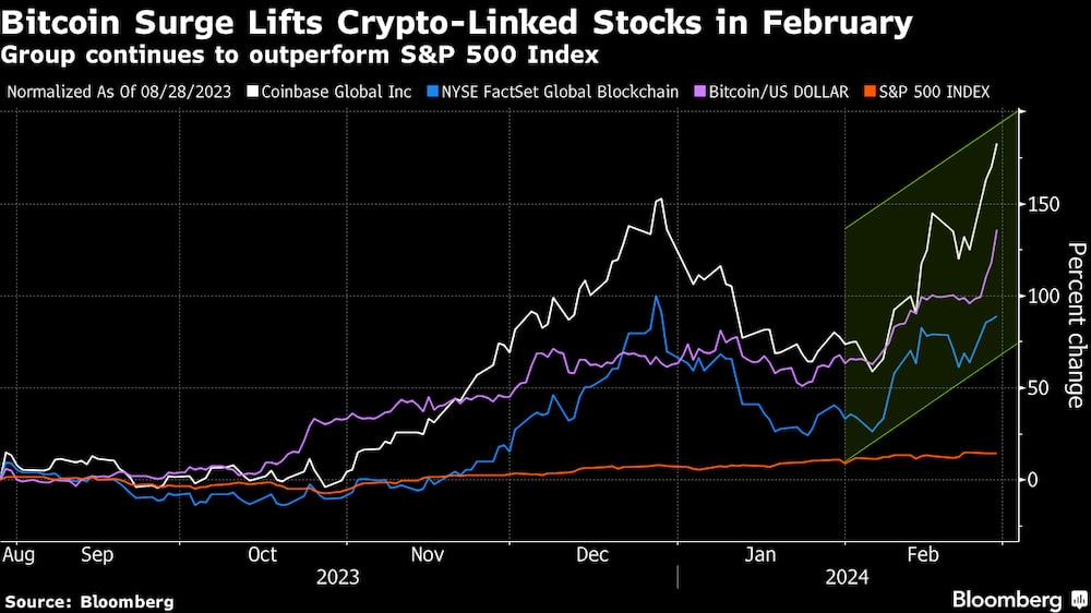 La criptomoneda más grande del mundo en términos de valor de mercado está en camino de ganar un 48% en febrero, su mejor rendimiento mensual desde diciembre de 2020. Eso ha ayudado a elevar un índice que rastrea las empresas vinculadas a los activos digitales hasta un 36% en febrero, después de caer más del 20% el mes anterior.