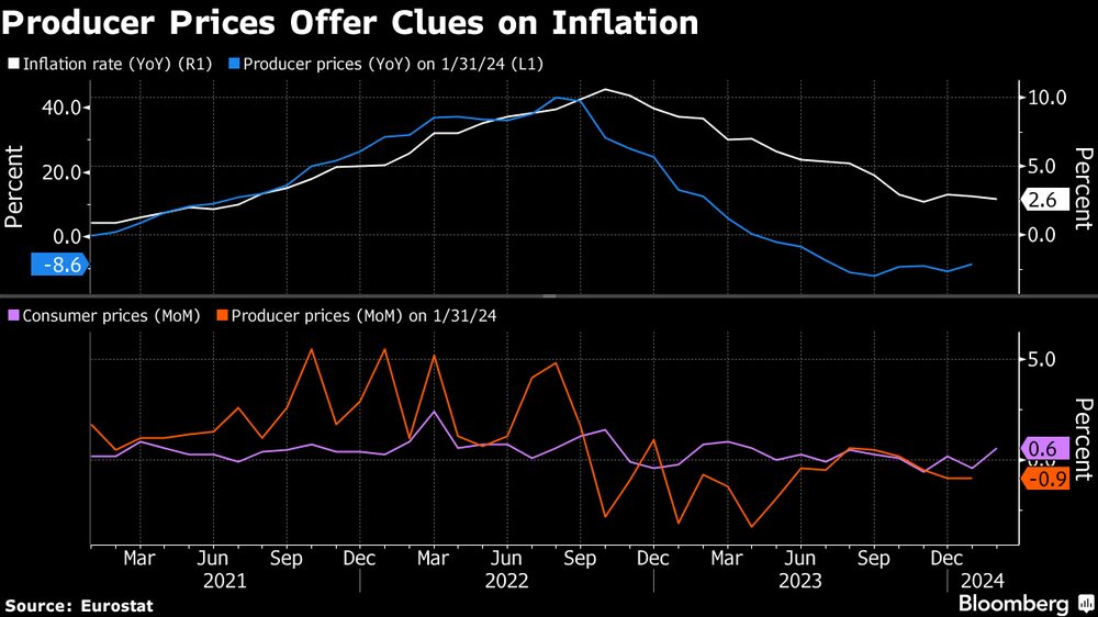 Los datos de precios de producción del martes mostraron una caída del 0,9% en el mes -igualando el ritmo de diciembre- y un descenso del 8,6% respecto al año anterior.