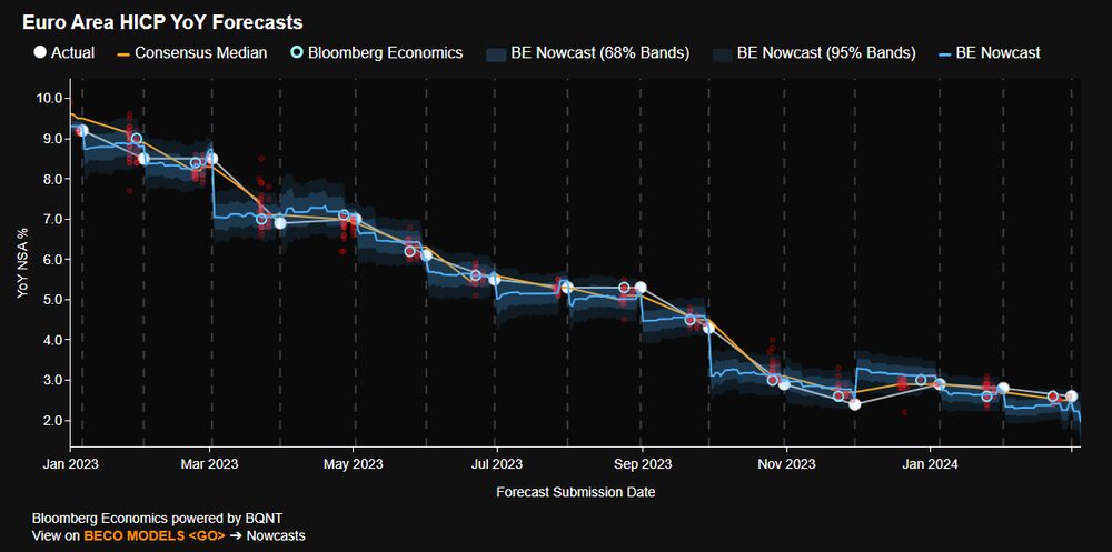 El indicador elaborado por Bloomberg Economics, que incorpora 32 variables que van desde el desempleo a los costes de la energía, acaba de alcanzar el 1,95%, después de que la caída de los precios de producción de enero publicada el martes alimentara el modelo.