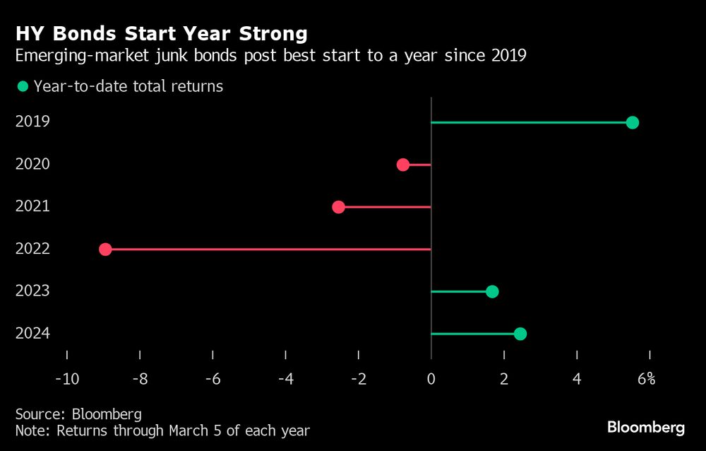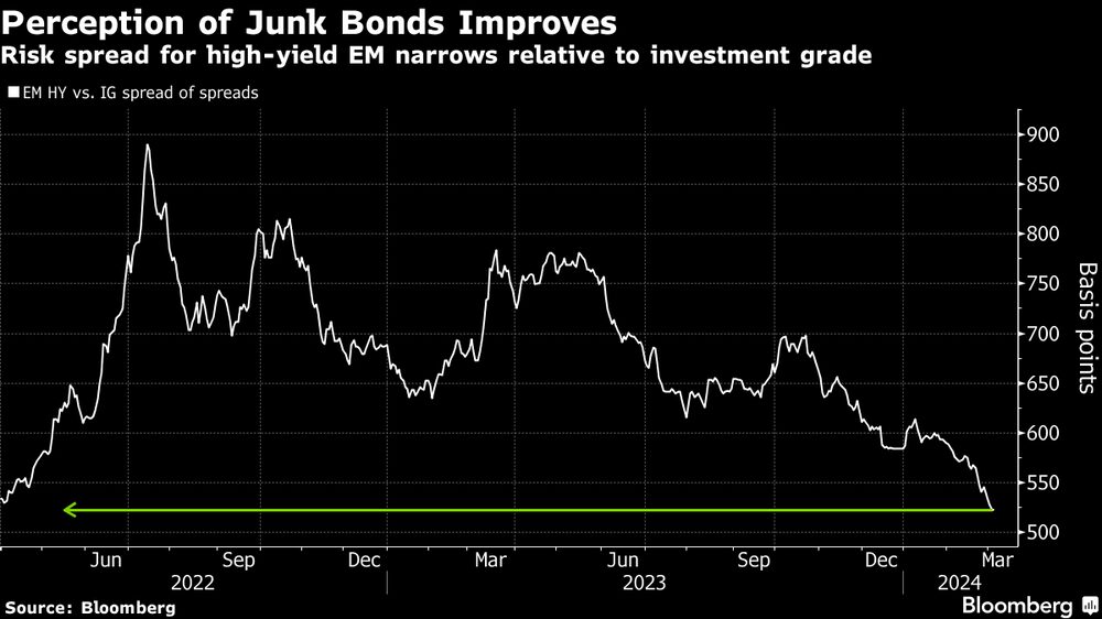 A medida que los precios de los bonos basura aumentan, el rendimiento adicional que exigen los inversores para mantener bonos soberanos de alto riesgo en lugar de bonos del Tesoro de EE. UU. ha disminuido en 56 puntos básicos este año, según datos de JPMorgan Chase & Co. Esto se compara con un aumento de 11 puntos básicos en bonos de grado de inversión. La brecha entre ambos ha caído a 513 puntos básicos, la más pequeña en dos años.