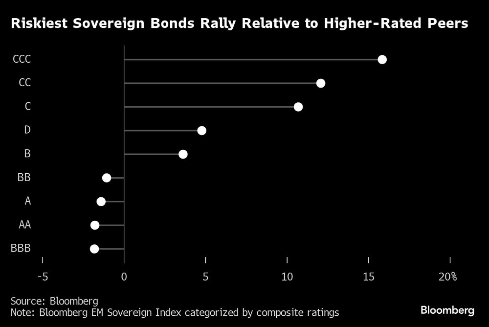 Los bonos en moneda fuerte de países con categoría de riesgo triple C han tenido un rendimiento del 16% este año, superando a los de todas las demás categorías y casi cinco veces el rendimiento promedio de los bonos de alto rendimiento emitidos por economías en desarrollo, según datos compilados en un índice de Bloomberg.