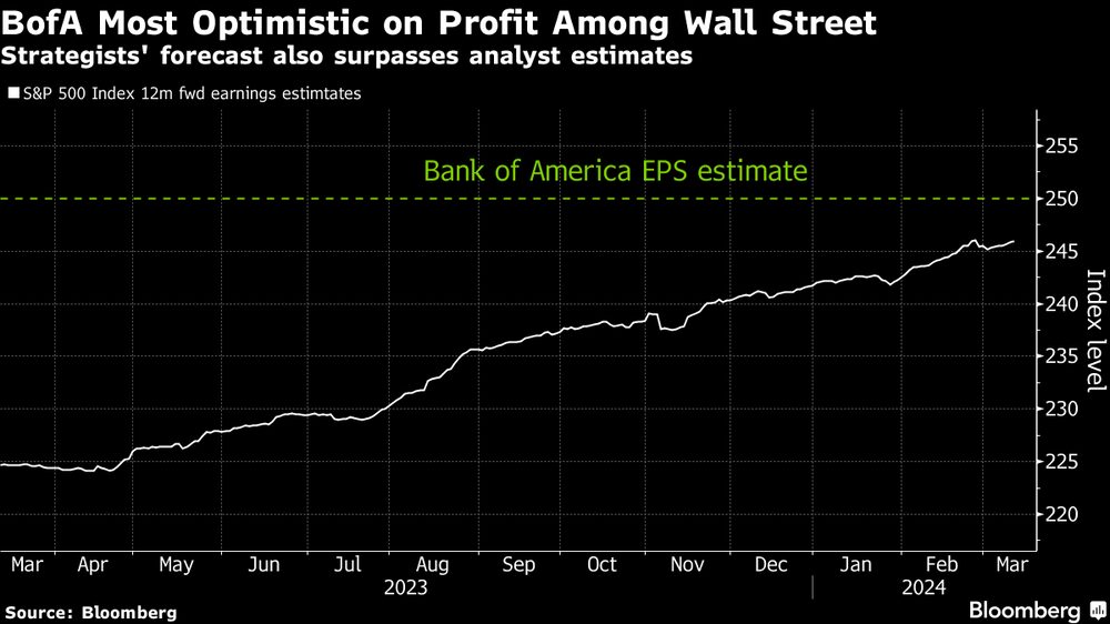 El pronóstico de ganancias fortalecido para este año sigue a una temporada de informes de ganancias sólida y una mejora de las expectativas del producto interno bruto de Estados Unidos por parte de los economistas de BofA, escribieron los estrategas en una nota. “2023 fue un año de transición para las empresas en Estados Unidos y ahora se han adaptado a la nueva tasa más alta y al entorno de demanda débil”, dijeron los estrategas.