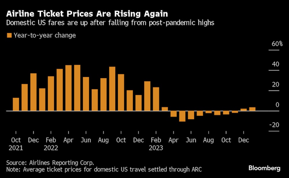 La perspectiva general para los precios de los boletos es menos definitiva. Las tarifas en Estados Unidos se dispararon en 2022 y principios de 2023 cuando los viajeros volvieron a llenar los cielos, pero luego cayeron durante la mayor parte del año pasado debido a la debilidad de la demanda nacional.