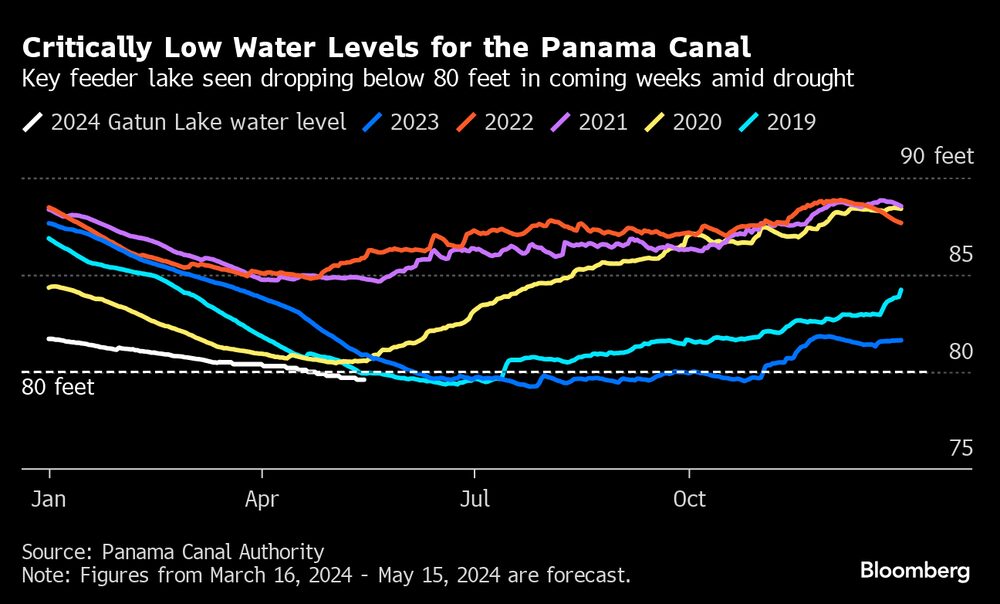 El Canal de Panamá sigue siendo un importante punto de congestión para el transporte marítimo mundial en medio de la sequía persistente, y las perspectivas de alivio son escasas. Los niveles de agua en el lago Gatún, el más grande de los dos lagos que alimentan el canal, ya están en los más bajos en al menos cinco años para esta época del año y se pronostica que caerán por debajo de los 80 pies en las próximas semanas.