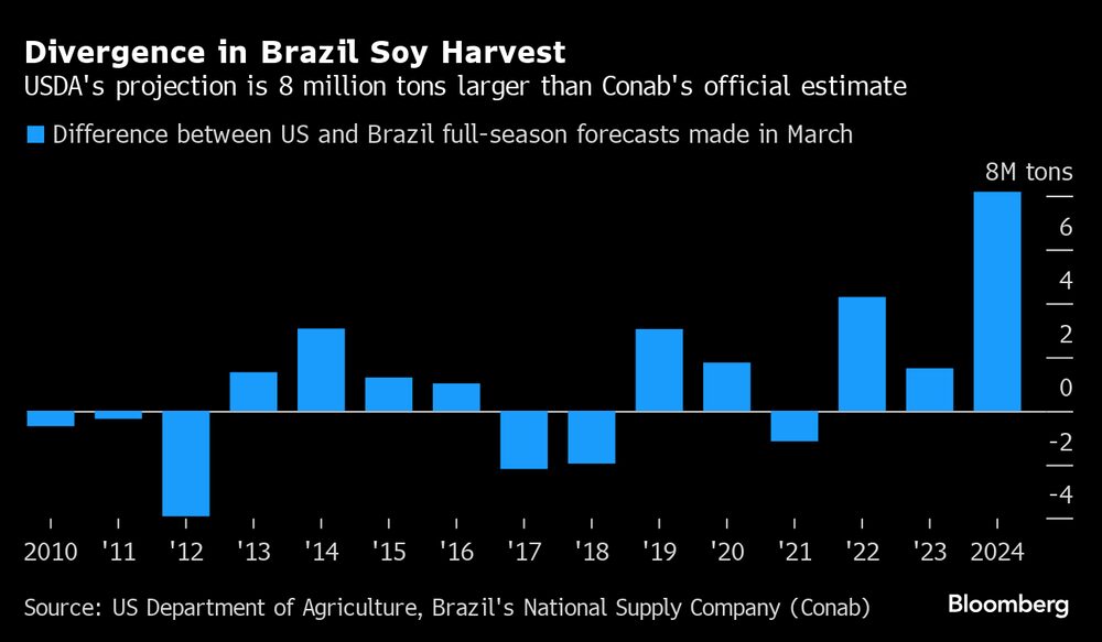 Esa es la mayor discrepancia de proyección en al menos 15 años en este punto de la temporada. Brasil ha estado reduciendo sus proyecciones después de que la sequía persistente erosionara los rendimientos. La diferencia en la estimación es “inusual y extraña” y sugiere que el Departamento de Agricultura de Estados Unidos está retrasado varios meses en el proceso de contabilización de las pérdidas de cultivos de Brasil, dijo Vinicius Ito, director de corretaje de futuros y opciones en Marex.