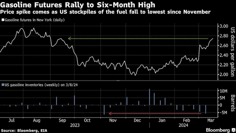 Los futuros de la gasolina, que tienen implicaciones en el surtidor minorista, están aumentando en un mal momento para los conductores estadounidenses, justo cuando se acerca la temporada de conducción en su punto máximo.