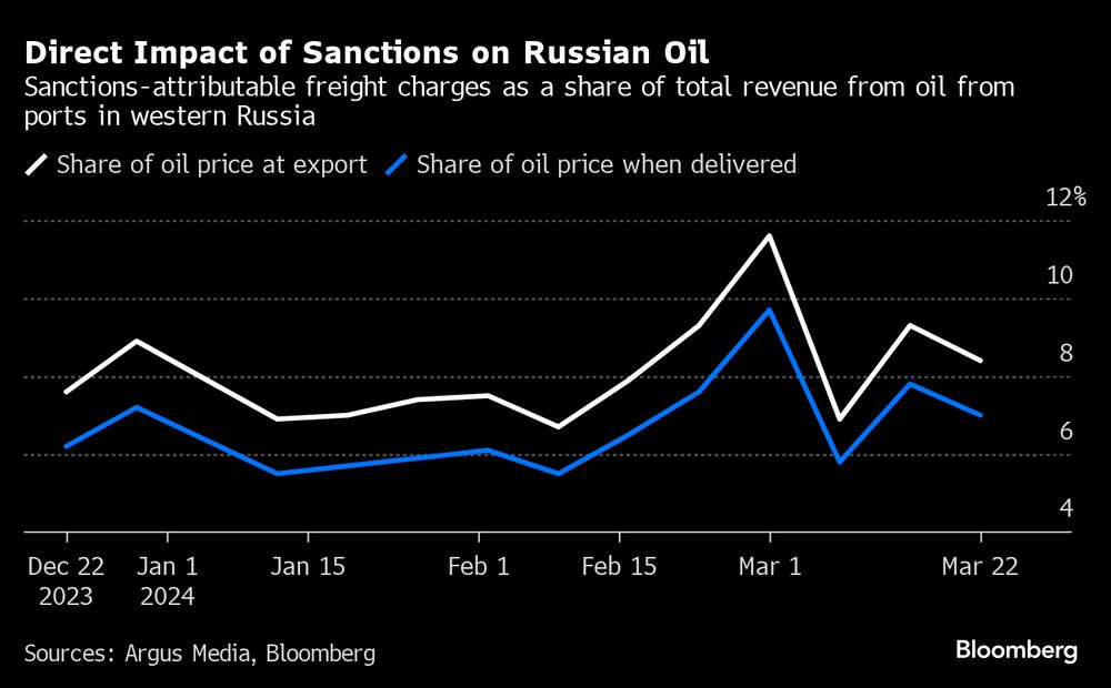 La agencia de información de precios Argus Media Ltd. elabora evaluaciones de los costes reales y de referencia del transporte de petróleo desde distintos puertos del oeste de Rusia a Asia y los utiliza para determinar cuánto es directamente atribuible a las sanciones.