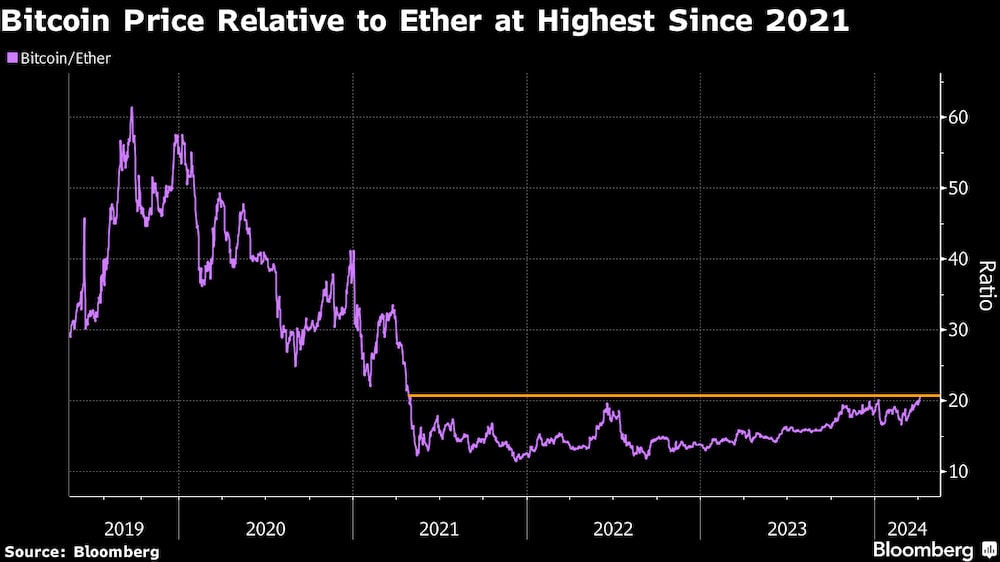 La relación escaló a 20 esta semana y alcanzó el nivel más alto desde abril de 2021, lo que refleja una demanda más resistente de la criptomoneda más antigua que de su rival más pequeña.