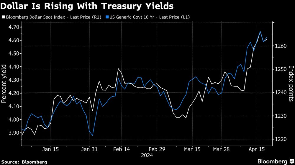 A medida que los mercados reducen sus apuestas a un recorte de tasas de la Fed, los rendimientos de los bonos del Tesoro se han disparado nuevamente en las últimas semanas, llevando los rendimientos de referencia cerca del 5%. Este repunte ha sido un factor importante del atractivo del dólar, que también se ha beneficiado de los continuos flujos hacia las acciones estadounidenses debido a la fiebre de la inteligencia artificial.