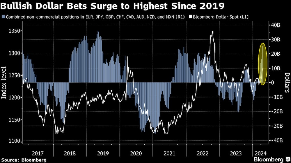 El índice del dólar de Bloomberg ha subido más del 4% este año, reflejando avances frente a todos los principales competidores en los mercados desarrollados y emergentes. Un popular indicador del sentimiento de los operadores apuntaba a una postura bajista a principios de año, pero desde entonces ha pasado a ser el más alcista desde 2019, según datos de la Commodity Futures Trading Commission.