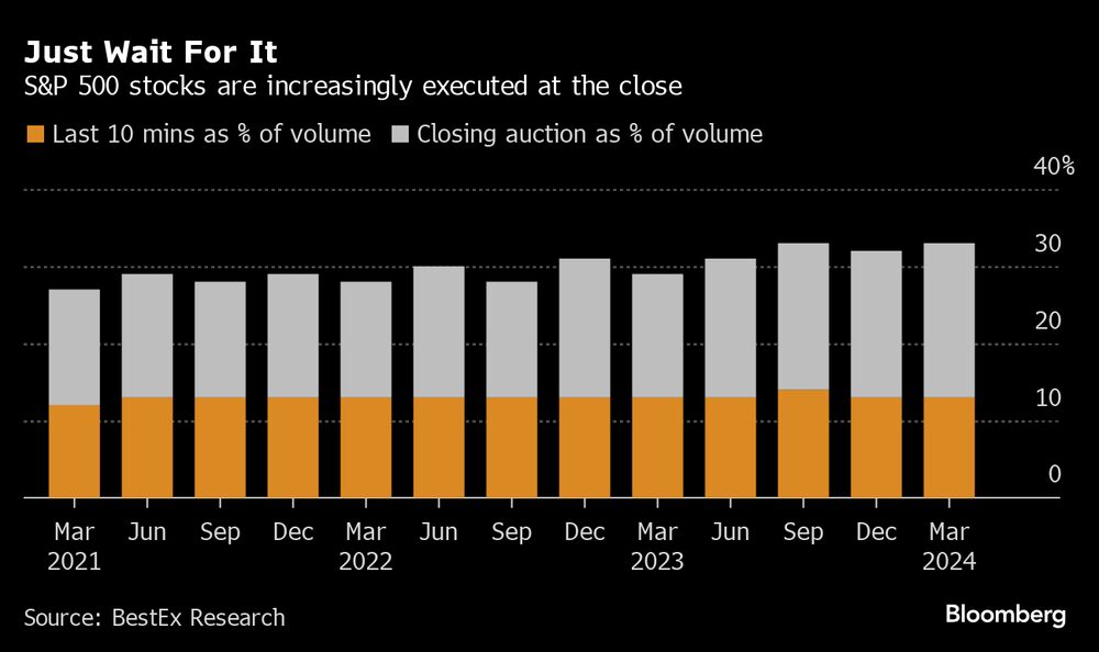 Alrededor de un tercio de todas las operaciones con acciones del S&P 500 se ejecutan ahora en los últimos 10 minutos de la sesión, según datos recopilados por BestEx Research, un desarrollador de algoritmos de negociación. Esta cifra es superior al 27% de 2021.