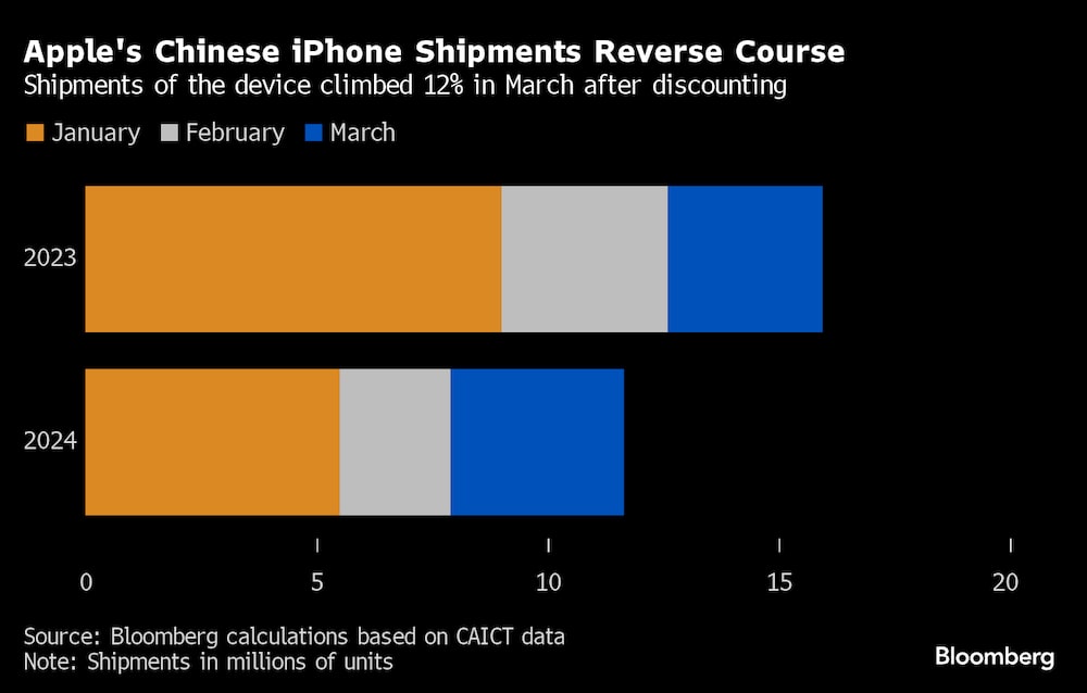 Bloomberg — Los envíos de iPhones en China aumentaron cerca de un 12% en marzo después de que Apple Inc. (AAPL) y sus minoristas rebajaran los precios, según datos oficiales. Es una señal de que los esfuerzos por detener la caída de las ventas están funcionando.