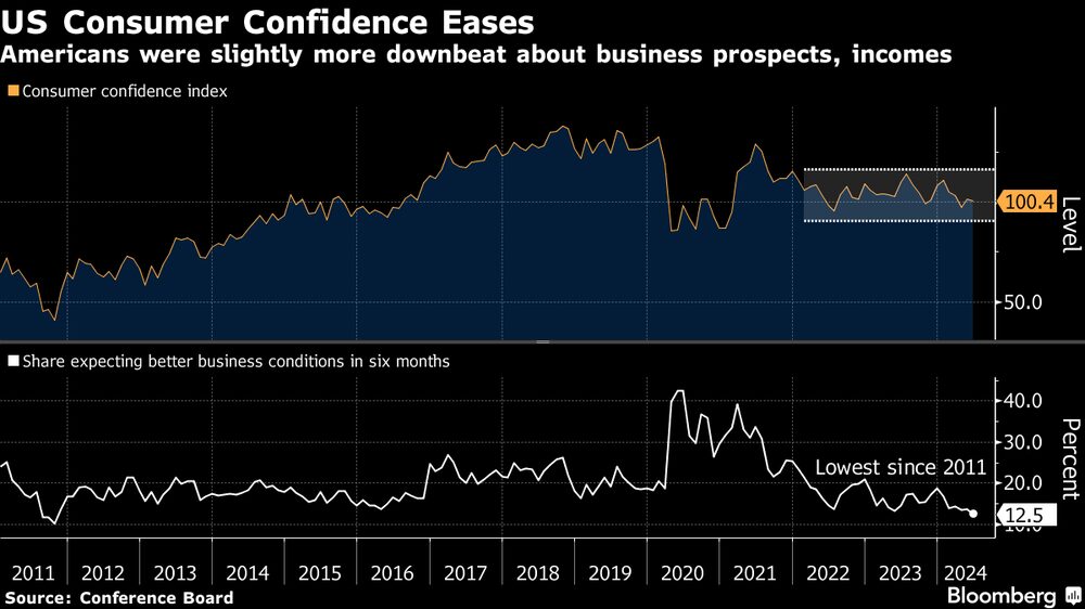 El indicador de confianza del Conference Board descendió a 100,4 desde una lectura revisada a la baja de 101,3 en mayo, según mostraron los datos publicados el martes. La estimación mediana en una encuesta de Bloomberg entre economistas pedía una lectura de 100.