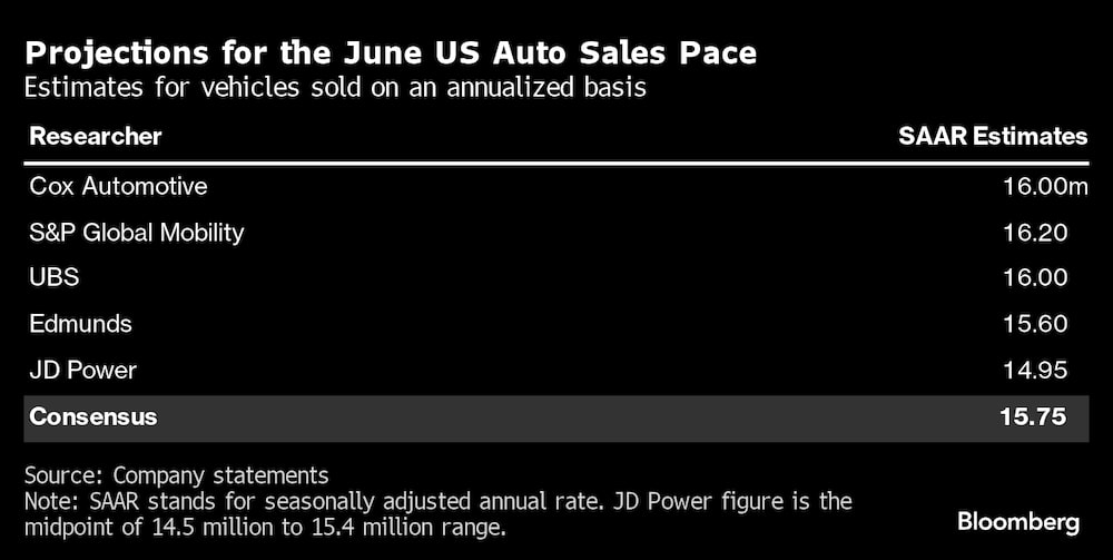 Las ventas de vehículos probablemente se desaceleraron a una tasa anualizada de alrededor de 15,8 millones de vehículos en junio, según un consenso de cinco investigadores del mercado, por debajo de los 16,1 millones de hace un año.